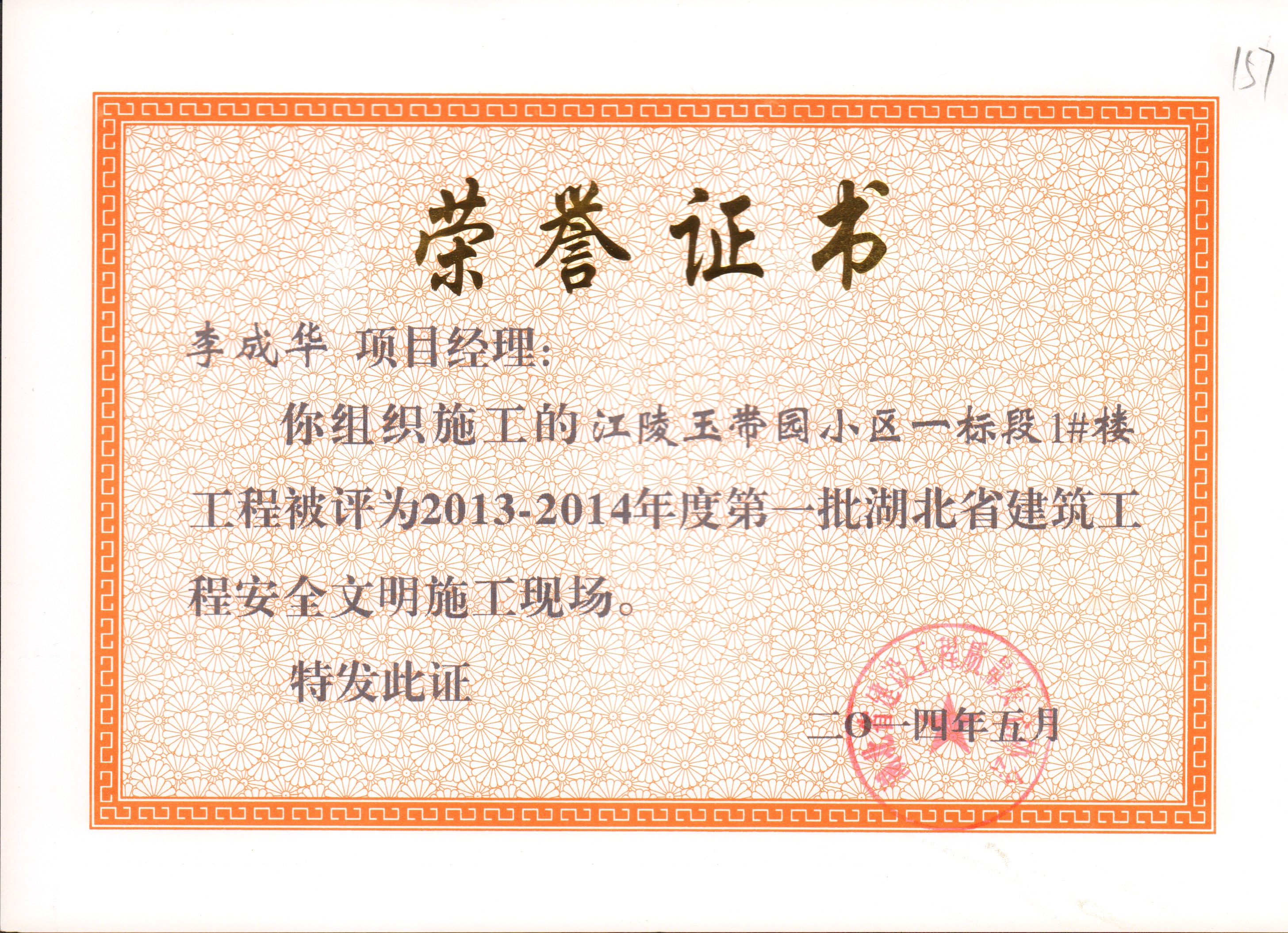 承包公司江陵玉带园2013-2014年度安全文明施工现场-李成华