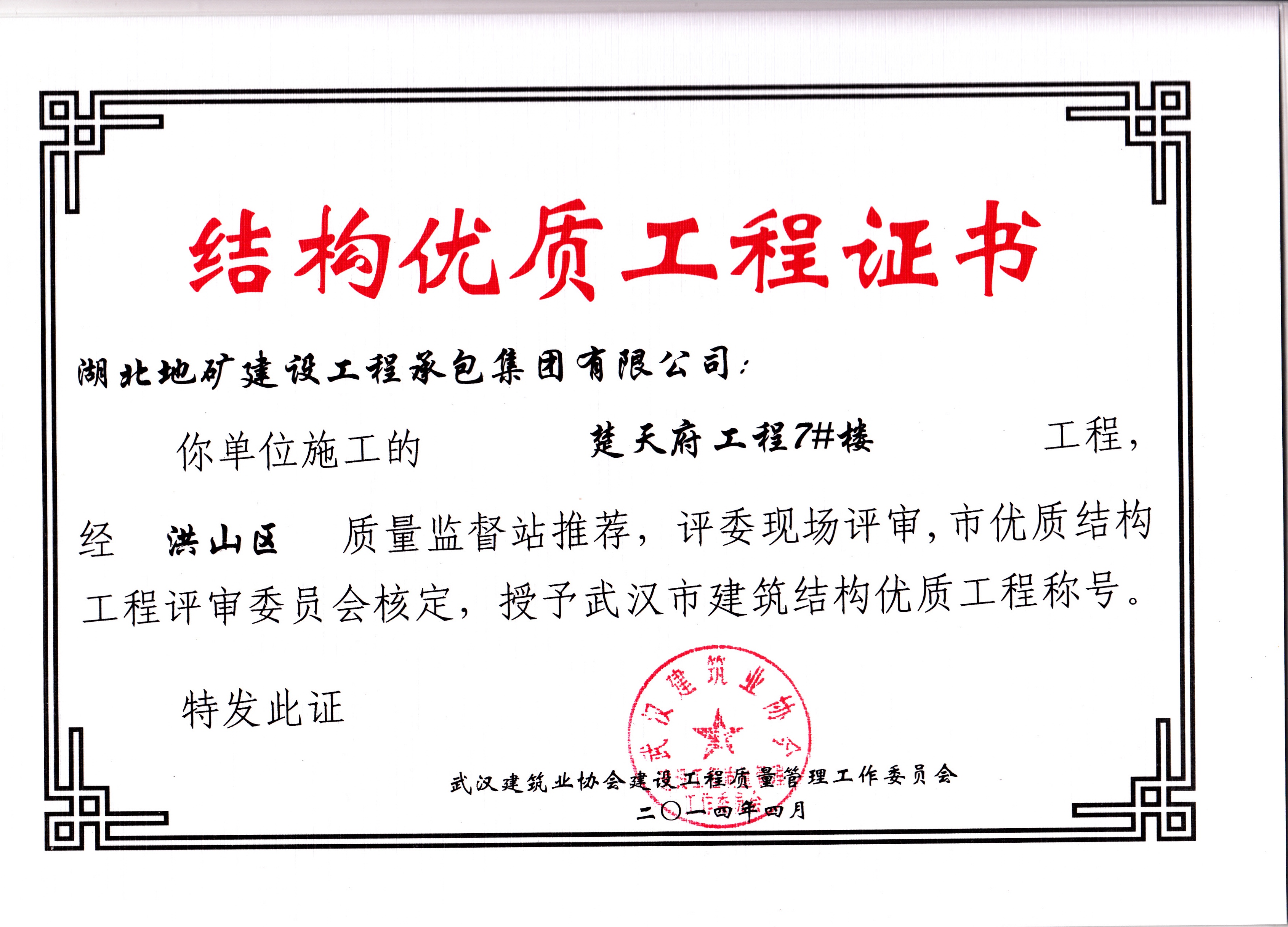 承包公司楚天府7#楼武汉市建筑结构优质工程
