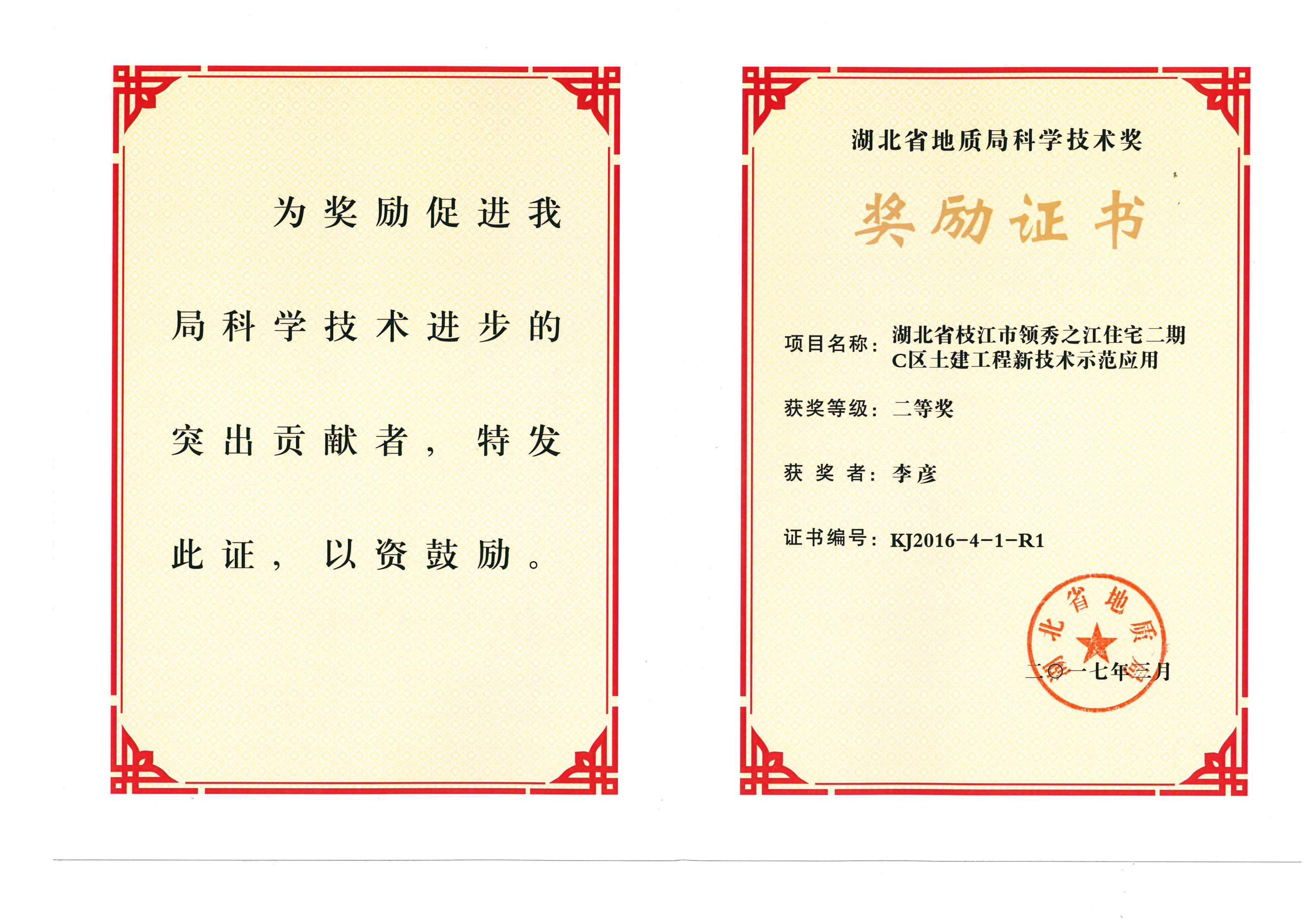 湖北省地质局科学技术奖(枝江市领秀之江住宅 李彦)