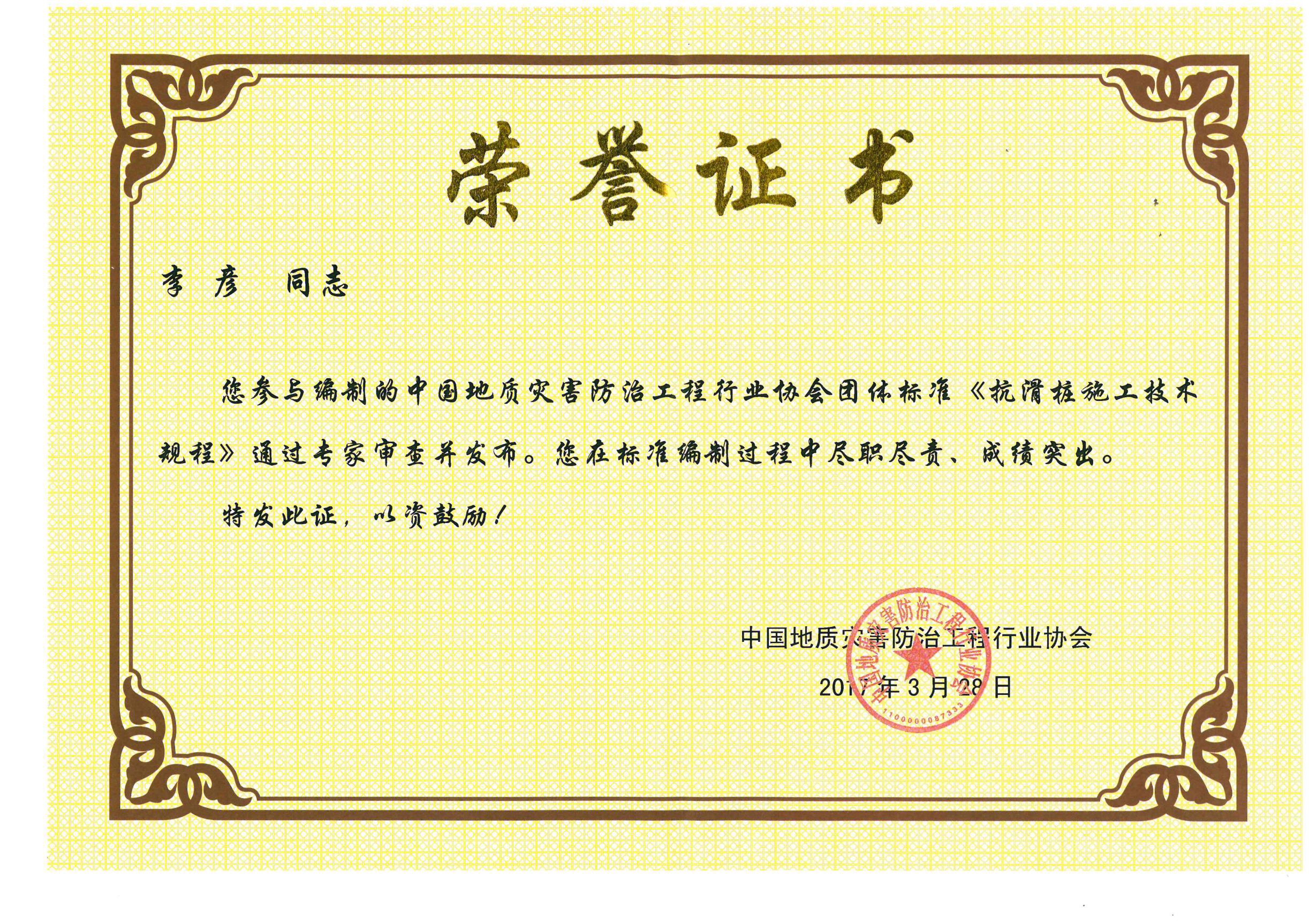 中国地质灾害防治工程行业协会编制《抗滑桩施工技术规程》——李彦