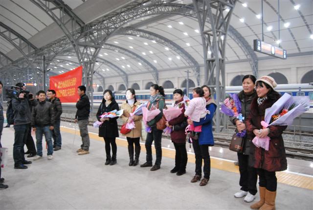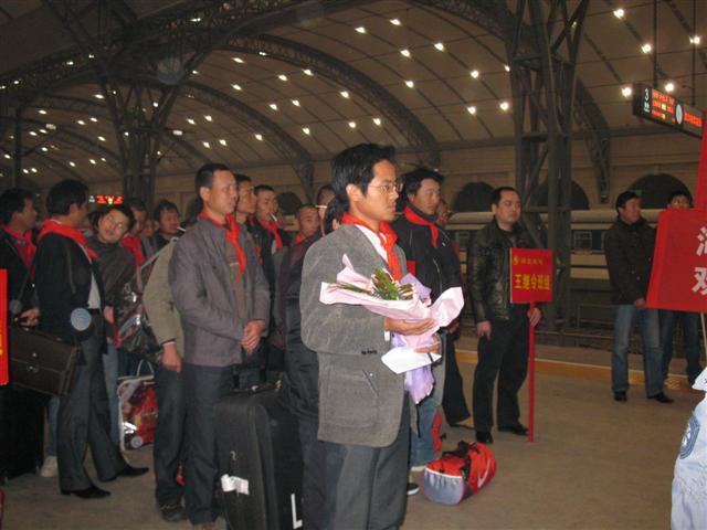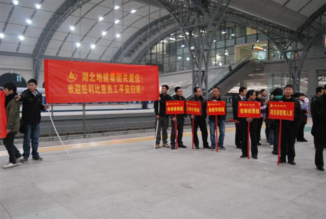 根据地建集团北京办事处发回的列车信息,为做好迎接最后一批回国人员,地建集团启动了安置预案,迅速安排了食宿和接送车辆,并妥善接待了家属。 21时20分,列车比预计时间提前8分钟到达,领导和家属第一时间送上了鲜花和问候,媒体记者也通过手中的相机记录了这感人至深的画面。各班组劳务工人有序的排队登记,他们对着摄像机高呼“祖国万岁”并齐声高唱中华人民共和国国歌,洪亮的歌声在站内响彻回荡,显得格外壮观。 曾环宇代表省地矿局发表了重要讲话,对地建集团组织此次安全撤离工作给予了充分肯定和高度评价,并对所有回归人员表示亲切的慰问。