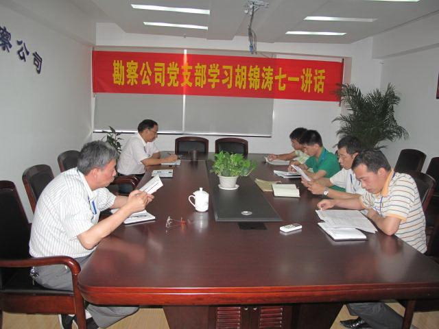 2011年7月12日,勘察公司党支部召开生活会,学习胡锦涛总书记在庆祝中国共产党成立90周年大会上的重要讲话精神。在学习中,公司党员干部重温了党的光辉历程,对“没有共产党就没有新中国” 有了更加深刻的认识。大家纷纷表示,今后要更自觉地以一名党员的标准要求自己,廉洁自律,全心全意为职工谋福利,为集团的二次创业作贡献,努力开创勘察公司的美好明天。