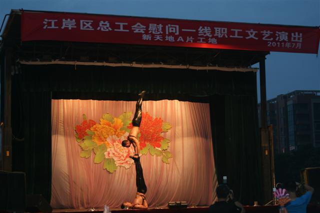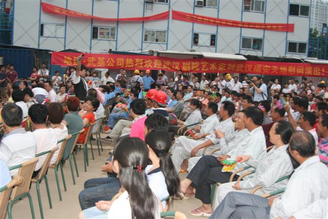 2011年7月14日晚,江岸区总工会在武汉地质勘察基础工程有限公司瑞安A1A2A3地块桩基项目施工现场举办慰问一线职工文艺演出。来自武汉剧院艺术家们表演的舞蹈、独唱、杂技、魔术、川剧变脸等一个个精彩纷呈的节目,博得了一阵阵热烈的掌声。特别是当演员们走下台来与观众互动,邀请观众对唱时,现场气氛更是鼎沸欢腾。