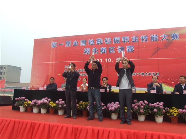 大赛闭幕式在雄壮的国歌声中开始进行。首先大赛总裁判长秦训松对本次地勘钻探职业技能大赛作了技术点评。接着,省国土资源厅、省人社厅、省地矿局领导分别作了重要讲话,他们勉励大家要进一步钻研技术,提升技艺水平,在服务经济社会发展的主战场创先争优,建功立业,为实现湖北地质找矿新突破作出贡献。最后各位领导分别为本次大赛的个人和单位颁奖。