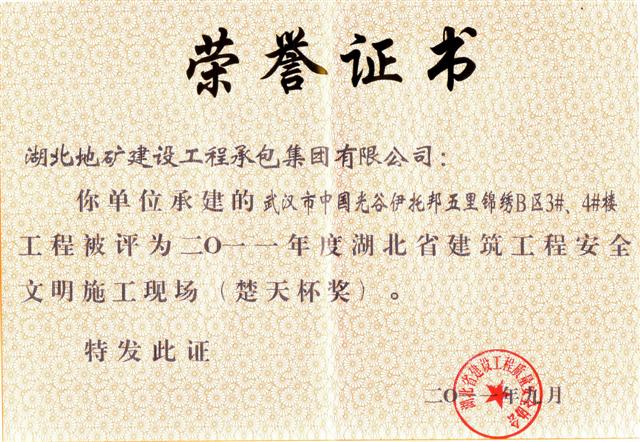 近日,湖北省住房和城乡建设厅通报了2011年—2012年度第一批湖北省建筑工程安全文明施工现场(楚天杯)评选结果。地建承包公司承建的武汉市中国光谷伊托邦五里锦绣B区3#、4#楼工程和武汉市湖北国土资源职业学院三号学生宿舍楼工程均获此荣誉。至此地建承包公司已累计获得9座省建筑工程“安全文明施工现场(楚天杯)”