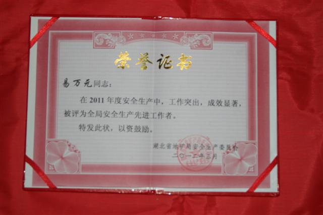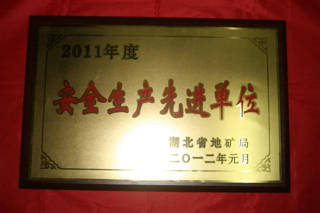 2011年度,武基公司积极推行安全标准化管理,安全生产工作取得了较好的成绩。3月16日,在湖北省地矿局2012年度安全工作会议上,公司被授予“2011年度湖北省地矿局安全生产先进单位” 荣誉称号,公司总经理易万元同志被授予 “2011年度湖北省地矿局安全生产先进工作者”荣誉称号。