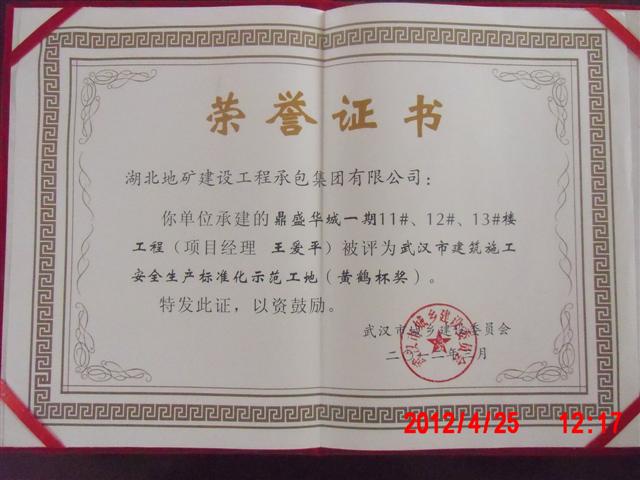 “黄鹤杯”奖是“武汉市建筑施工安全质量标准化示范工地”的简称,是武汉市建筑行业工程质量的最高荣誉。此荣誉的获得既是对鼎盛华城一期11#12#13#楼项目部前期的安全文明施工工作的肯定,也为该项目部争创“安全文明施工现场”(楚天杯)奖创造了前提条件。项目部全体管理人员表示将再接再厉搞好后期安全文明施工,争创更高荣誉——“楚天杯”奖。