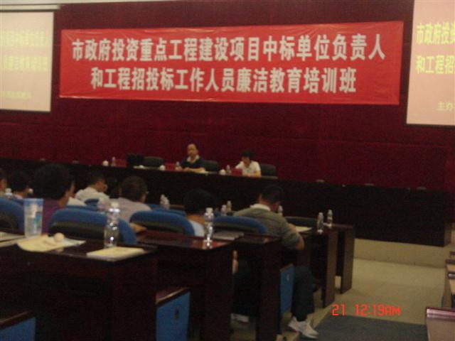 6月18日,珠海市城乡规划建设局、纪检委、检察院在珠海市委党校举办市政府投资重点工程建设项目中标单位负责人和工程招标工作人员廉洁教育培训班,分公司领导冯诚及负责招投标工作的经营人员参加了培训。 参培人员观看了警示片《工程建设领域腐败剖视录》,听取了珠海市检察院廉政办公室所做的《2011年度珠海市建设领域廉政工作报告》,参观了《共和国拒绝腐败》图片展。 培训后,分公司领导和有关人员写了心得体会,纷纷表示,一定要清清白白做人,踏踏实实做工程,展现湖北地建人清正廉洁的精神风貌。