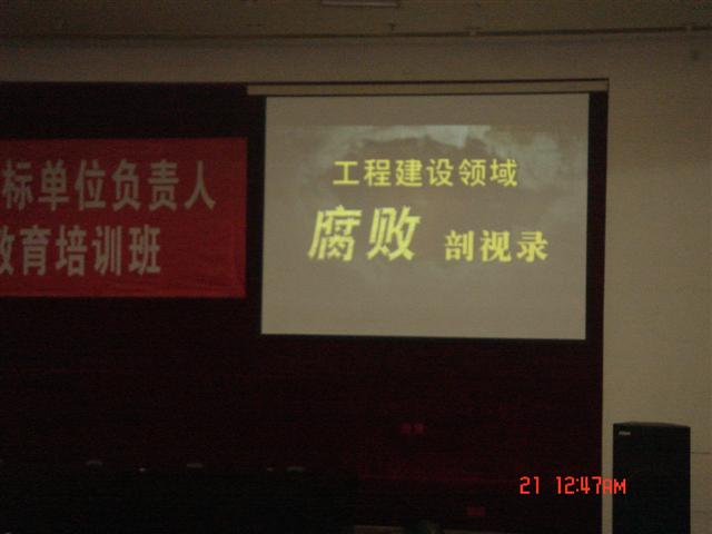 参培人员观看了警示片《工程建设领域腐败剖视录》,听取了珠海市检察院廉政办公室所做的《2011年度珠海市建设领域廉政工作报告》,参观了《共和国拒绝腐败》图片展。