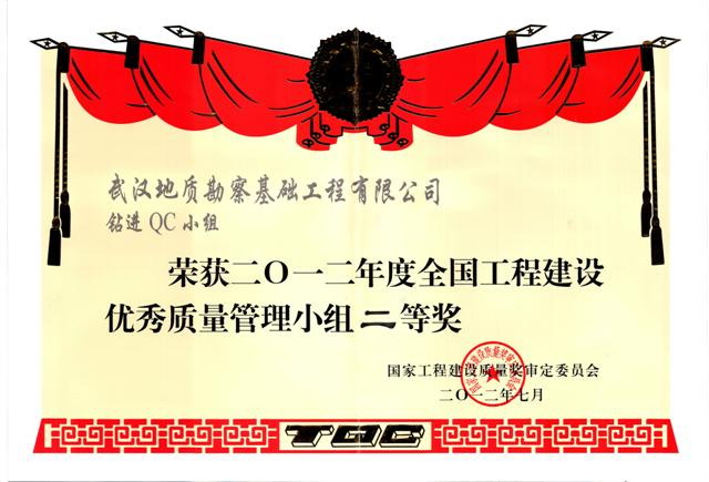7月2日至7月6日,在中国施工业协会工程建设质量管理协会举办的2012年全国工程建设质量管理小组代表会议上,武基公司钻进QC小组“提高旋挖钻机嵌岩施工效率”参加了本次大会成果发布,经大会评审组专家评审,国家工程建设质量奖审定委员会审定,该QC小组荣获全国工程建设优秀质量管理小组二等奖。