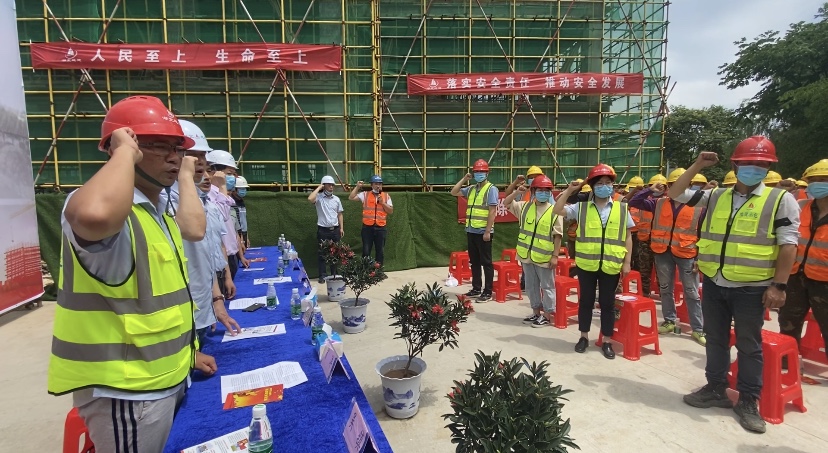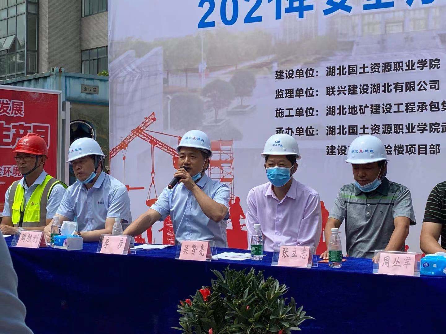 2021年6月4日上午,湖北地矿建设工程承包集团有限公司在湖北国土资源职业学院武汉校区建设项目实验楼项目部举办了2021年“安全生产月”启动仪式。湖北省城市地质工程院党委副书记张立志,承包公司总经理李彦,副总经理周胜利,总经理助理陈昊,实验楼项目建设单位、监理单位相关领导,公司安全生产部,实验楼项目部全体管理人员及工友代表等近百人在主会场参会,承包公司各项目部通过视频分会场参会。
