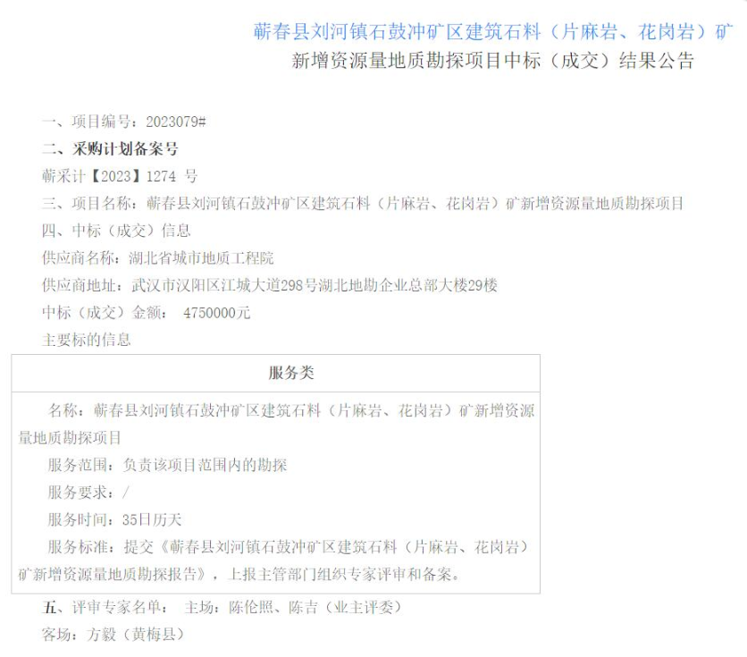 2023年9月,承包公司深入学习贯彻习近平总书记给山东省地矿局第六地质大队重要回信精神,按照省委省政府“发挥地质作用”“展现更大作为”重要要求,深入贯彻落实院“项目经营年”活动,切实履行公益职能,生态地质环境科技分公司中标蕲春县刘河镇石鼓冲矿区建筑石料(片麻岩、花岗岩)矿新增资源量地质勘探项目(中标金额475万元)和十堰郧西县上津镇扒山沟矿区建筑用白云岩矿勘探项目(中标金额197.5万元)。
