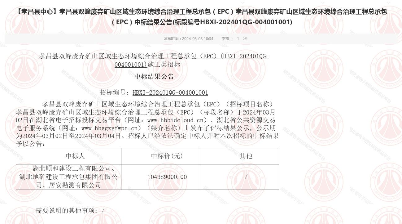 孝昌县双峰废弃矿山区域生态环境综合治理工程总承包(EPC)项目,实施范围包括孝昌县周巷镇双峰村、大屋村、龙泉村、安全村、九峰村等5个行政村,国土面积4.99平方公里。主要建设内容包括矿山生态修复治理、农村生活污水处理、农用地修复治理、淤塞河道生态修复及边坡治理等。我公司负责该项目矿山生态修复治理工程实施。