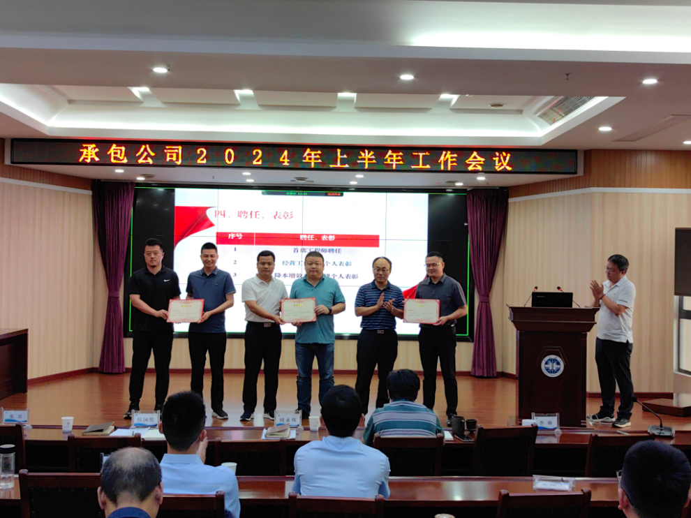 8月16日,承包公司召开2024年上半年工作会议。会议学习贯彻党的二十届三中全会精神、传达学习省领导讲话精神和局党委会关于安全生产工作的重要指示。总结分析上半年生产经营情况,结合新形势新任务,分析存在的问题,交流工作经验,部署安排下半年重点工作。会议表彰了3名“经营工作先进个人”、1名“降本增效工作先进个人”;颁发了公司2024年度首席工程师聘任证书;对2024年各二级单位、各部门工作总体情况行民主评议。