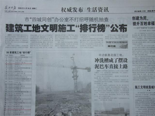 2008年3月18日,《长江日报》第5版刊登了武汉市“四城同创”办公室(即创建全国文明城市、国家卫生城市、国家环保模范城市和国家园林城市办公室)组织开展的随机抽查评比建筑工地文明施工活动的结果,我公司承接的“地调科技大楼项目”在活动中脱颖而出,排名全市第四;“职工医院项目”也榜上有名。