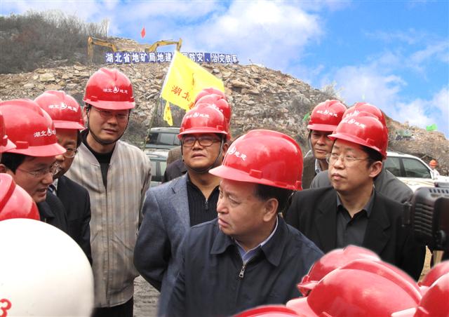 2月24日下午,湖北省委书记罗清泉在黄石市市委、市政府领导的陪同下,到湖北地建承包公司承接施工的黄石市板岩山地质灾害治理工程现场视察。省地矿局副局长刘洪峰、企业指导处副处长秦训松、省地建工程院院长程立文、省环境地质总站总工程师孙仁先等同志到现场迎接。。