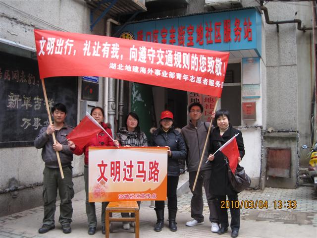 为了迎接3.5“中国青年志愿者服务日”,湖北地建海外事业部团支部联络了硚口区宝地社区居委会,组织员工于3月4日13:00前往建设大道云都酒店路口进行“文明过马路”主题宣传活动。活动得到全体在汉员工的积极响应,大家纷纷带上小红帽、挽起宣传章、拿上小红旗,成为一名光荣的志愿者,为路人提供了热情周到的服务。