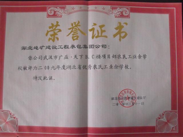 2010年3月11日,湖北地建承包公司广益·天下B、C栋项目部荣获2009年度湖北省优秀农民工业余学校荣誉称号,湖北省住房和城乡建设厅颁发荣誉证书。