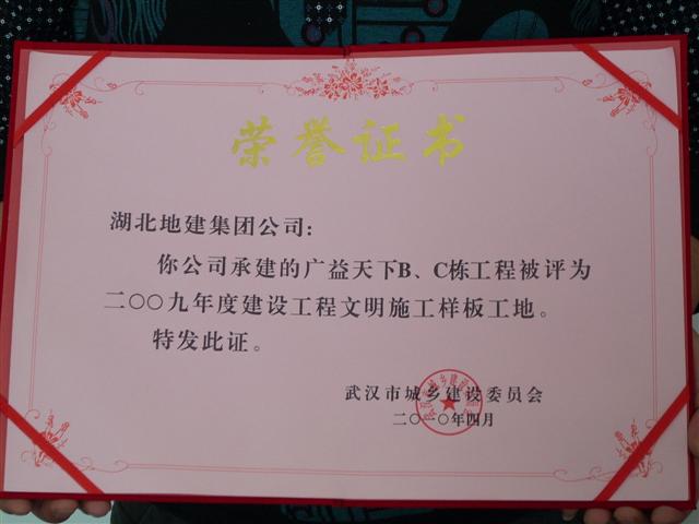 2010年4月,广益·天下B、C栋项目荣获2009年度建设工程文明施工样板工地荣誉称号,同时,该项目经理张焕生被评为武汉市2009年度建设工程文明施工管理优秀项目经理,武汉市城乡建设委员会颁发荣誉证书。