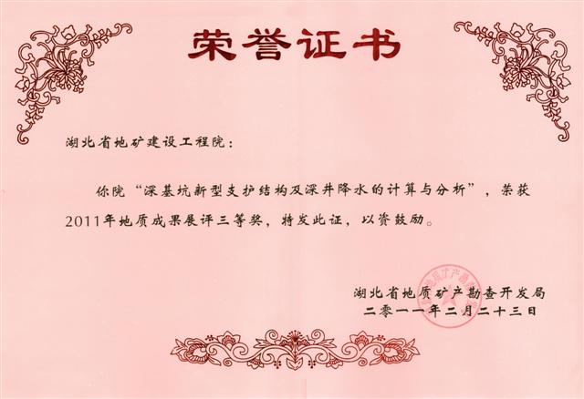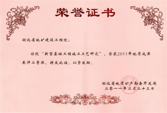 全局34项地质成果参加了地质成果展评, 29项成果参加评选,(包括工程院选送的“湖北省工程建设工法的开发”成果在内的5项成果因近两年在省局或省厅获过奖而不参加本次评奖),共评出壹等奖2项,贰等奖4项,叁等奖8项。由工程院选送的“新型基础工程施工工艺研究”成果荣获贰等奖,“深基坑新型支护结构及深井降水的计算与分析” 成果荣获叁等奖。