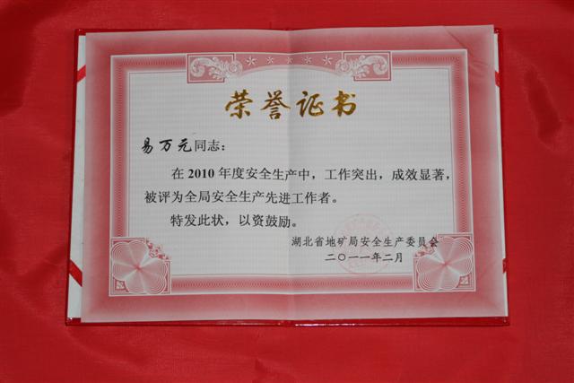 2011年3月4日,省地矿局召开 2011年安全生产工作会议。会议对省、局安全生产先进单位和个人进行了奖励。武基公司荣获“省地矿局2010年度安全生产先进单位”,公司总经理易万元被评为“省地矿局安全生产先进工作者”,获“全省安全生产先进工作者”称号的武基公司安全科长赵宏伟还以《履行安全生产管理职责,做一名合格的安全生产“守卫者”》为题在大会上作了安全工作经验交流。