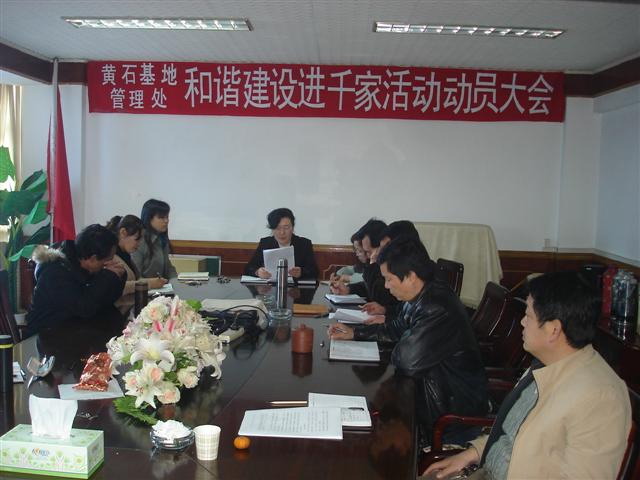 2011年3月25日下午,黄石基地管理处召开了“和谐建设进千家”活动动员大会。会议以“访民情、办实事、化矛盾、促和谐”为主题;以结合职工实际、围绕职工群众最关心、最直接、最现实的利益问题,努力为职工群众多办解民忧、谋民利、化民怨的实事好事为宗旨;围绕促进和谐基地建设,大力开展“送政策、送健康、送服务、送温暖”等活动,通过走访慰问,把党的关怀与温暖送到职工群众手中。该活动分3个工作小组,将分别走访四个小区,从
