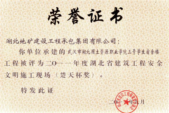 据悉,“安全文明施工现场(楚天杯)”奖是湖北省建筑行业安全文明施工的最高荣誉奖项,目的在于鼓励建筑施工企业搞好安全文明施工,提高全省建筑施工安全生产水平。该奖项的评定是从建设、施工、监理等方面,对项目现场进行全方位考评。 另讯,日前收到湖北省住房和城乡建设厅文件《关于公布2010-2011年度第一批湖北省建筑结构优质工程名单的通知》(鄂建文〔2011〕61号),地建承包公司承建的湖北国土资源职业学院汉南新校区图文中心工程和鄂东北地质大队孝感基地经济适用房工程名列其中。